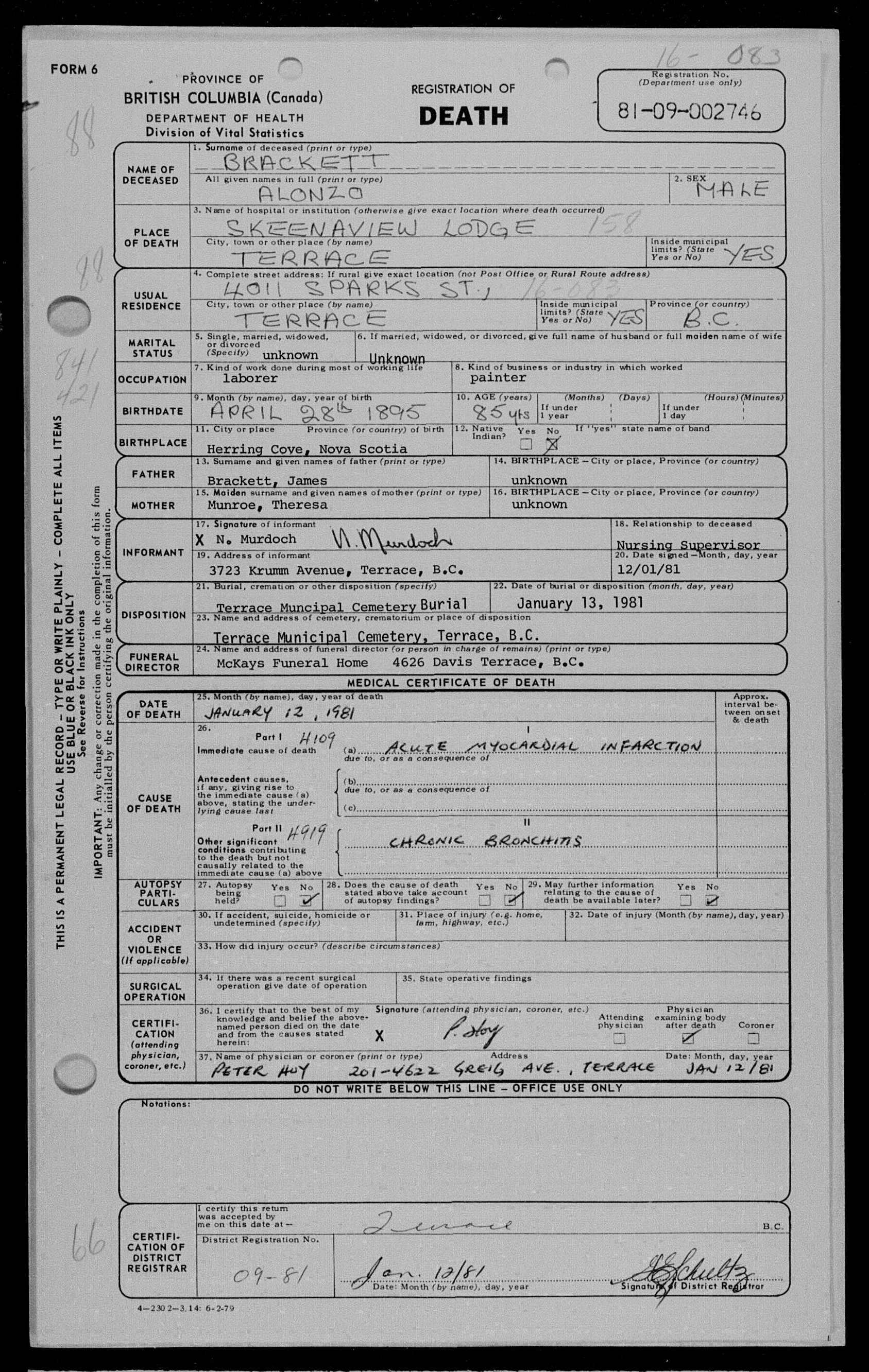 Died 12 Jan 1981, British Columbia