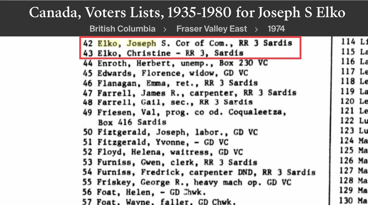 This is a Voters Census in 1975, shows him living in Chilliwack (where I live) as his job at that time was Corps of Commissionaires. The Corps of Commissionaires is an organization that offers Security Services etc, and usually the members are all EX - Military. So he “probably” worked at the Canadian Army Base in Chilliwack (it’s where the Engineer School was located)…….and probably was on of the Corps members who worked at the Front Gate to the base